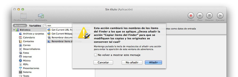 Especial atención a lo que pone después (¿Desea añadir la acción «Copiar ítems del Finder» para que se modifiquen las copias y los originales se conserven tal cual?) Esto lo que viene a decir es que, si añadimos esa acción, los archivos a renombrar se copiarán en otro lugar -a elegir- y con el nombre deseado. Puede ser útil mantener los originales con su nombre inicial pero también hay que tener en cuenta que si los archivos son muy grandes, nos va a comer mucho espacio e incluso puede que no funcione bien si nuestro disco duro está casi lleno… Para nuestro ejemplo haremos click en No añadir