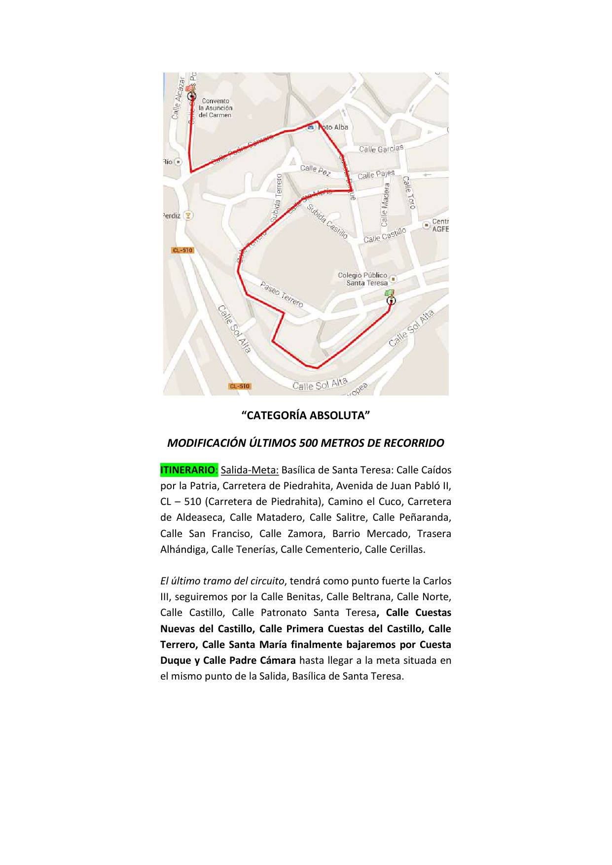 Así pues, el último tramo del recorrido, transcurre por: CALLE PATRONATO SANTA TERESA, CALLE CUESTAS NUEVAS DEL CASTILLO, CALLE PRIMERA CUESTAS DEL CASTILLO, CALLE TERRERO, CALLE SANTA MARÍA, CUESTA DUQUE Y CALLE PADRE CÁMARA, hasta llegar a la Meta situada en el mismo puno de la Salida, Basílica de Santa Teresa.